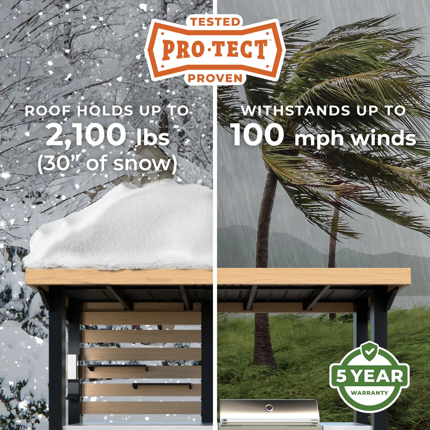 All-Weather Durability: Pro-Tect™ tested and proven to withstand up to 2,100 pounds or 30 inches of snow load, and winds up to 100 mph* with a full coverage galvanized steel roof
