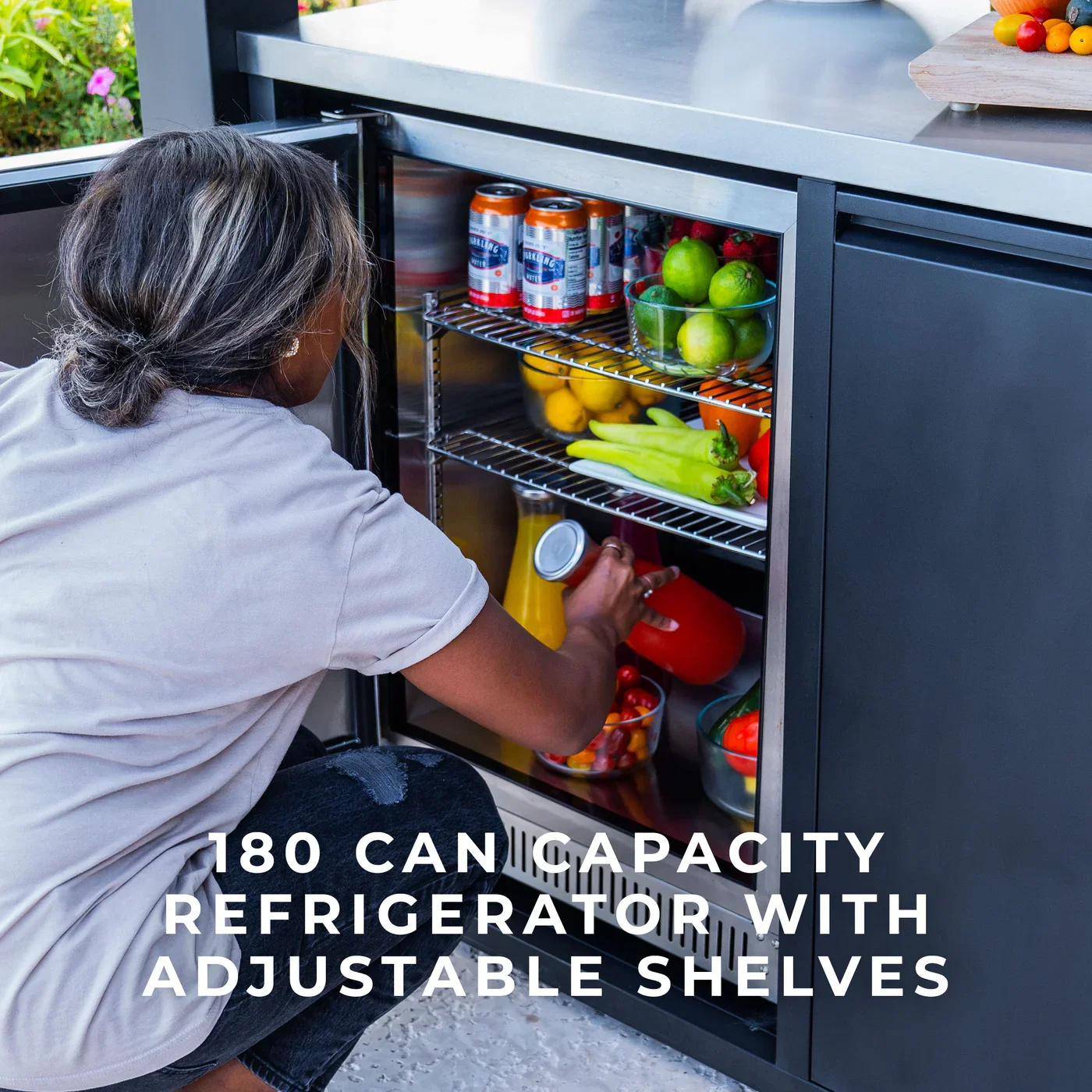 - Outdoor-Rated Refrigerator: 304 stainless steel construction withstands temperatures over 100°F and features a 23-inch design, LED interior light, and single-zone 3-layer storage offering 5.3 cubic feet of space for up to 180 cans